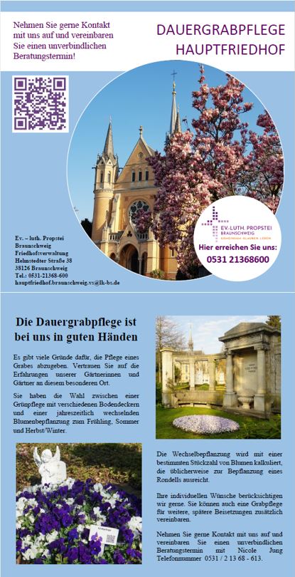 Mit einem Legat für eine Dauergrabpflege können Sie die Pflege einer individuell gestalteten Grabanlage auf dem HAUPTFRIEDHOF BRAUNSCHWEIG über Ihren Tod hinaus mit uns absichern.