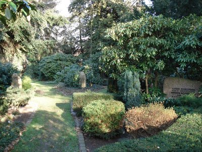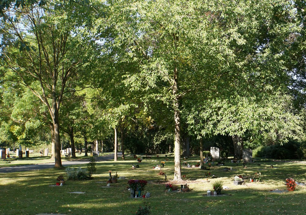 In Abt. 23 sind nur Findlinge entsprechend den Gestaltungsvorgaben erlaubt. In Abt. 61 sind bodenbündige Namensplatten mit vertiefter Inschrift vorgeschrieben. Das Format beträgt einheitlich 70 cm Breite, 50 cm Höhe, mindestens 6 cm Stärke. Aufgeschraubte Vasen und Grablichter, Steine in Buchform sowie aufgesetzte Buchstaben sind nicht gestattet. Die Genehmigung wird vom Steinmetz bei der Friedhofsverwaltung beantragt. Für Grabmalgenehmigung, laufende Kontrolle der Standsicherheit und Abräumung der Grabmale nach Ablauf der Nutzungsrechte werden Gebühren erhoben. Diese sind im Voraus zu entrichten.
