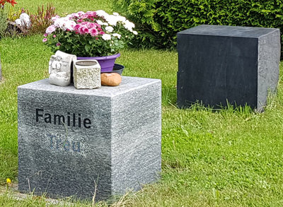 Ein Würfelstein bzw. eine Stele wird von den Angehörigen beauftragt; sie müssen Gestaltungs- vorgaben entsprechen. Die Genehmigung wird vom Steinmetz bei der Friedhofsverwaltung beantragt. Für Grabmalgenehmigung, laufende Kontrolle der Standsicherheit und Abräumung der Grabmale nach Ablauf der Nutzungsrechte werden Gebühren erhoben. Diese sind im Voraus zu entrichten.